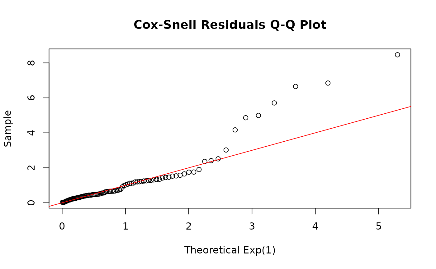 Q-Q plot of Cox-Snell residuals against Exp(1) to check overall fit