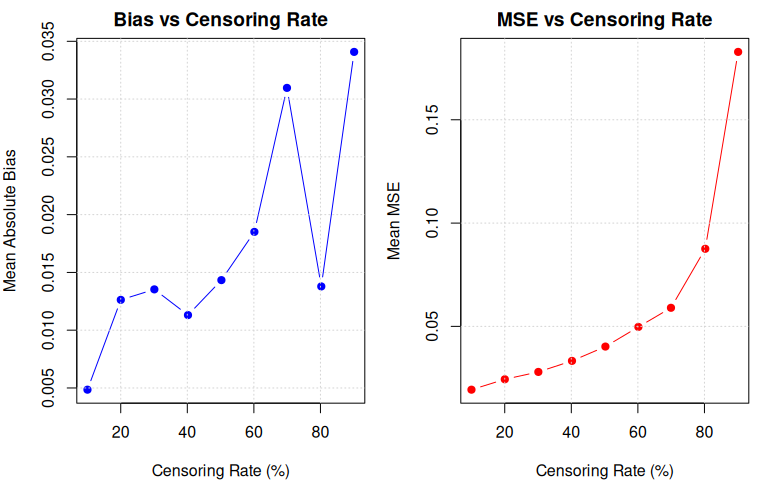 col.names = c("Censoring %", "Mean |Bias|", "Mean MSE", "Mean RMSE"))| Censoring % | Mean |Bias| | Mean MSE | Mean RMSE |