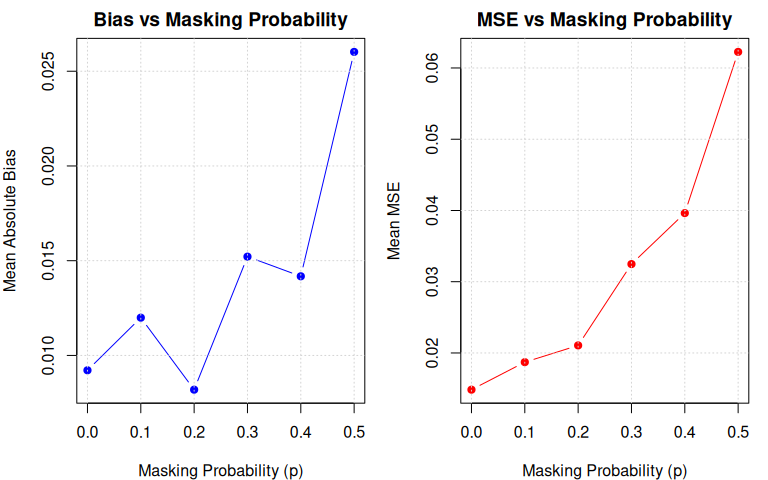 col.names = c("Masking Prob.", "Mean |Bias|", "Mean MSE", "Mean RMSE"))| Masking Prob. | Mean |Bias| | Mean MSE | Mean RMSE |