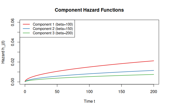 #> System mean lifetime: 58.89Component hazards