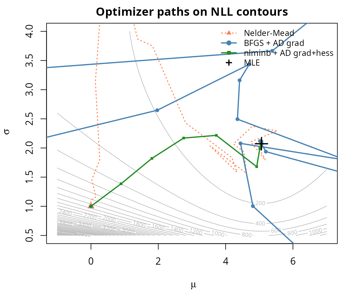 #> optim+AD MLE: mu = 5.065088 sigma = 2.072401nlminb() with AD gradient + Hessian