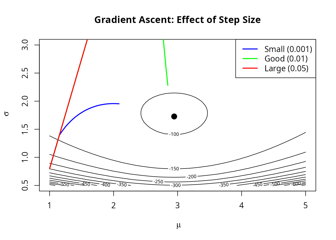 #> Direction: move right in mu, up in sigmaGradient Ascent